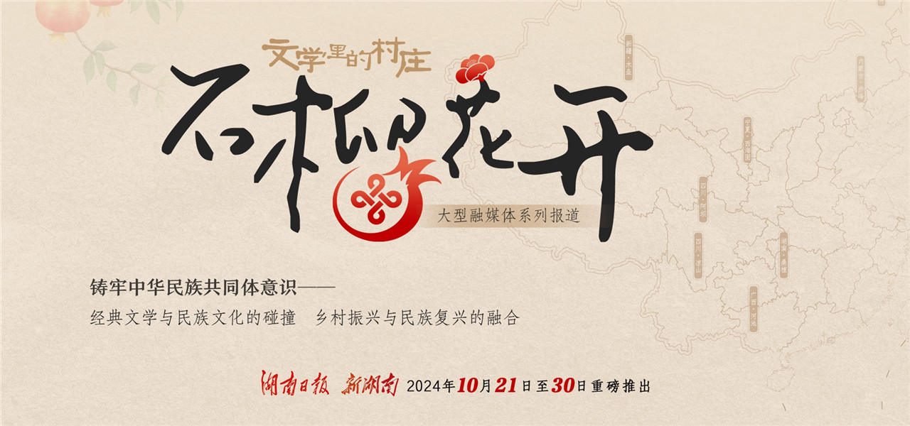 在習近平總書記鮮明提出“中華民族共同體意識”10周年及文藝工作座談會召開10周年之際,在全國民族團結進步表彰大會剛剛落幕之時,湖南日報精選8位作家和他們多個獎項的作品,派出8路融媒體團隊,奔赴多彩的民族村莊進行采訪。精選民族經(jīng)典,穿越大美中國。自10月21日起,湖南日報推出《文學里的村莊·石榴花開》大型融媒體系列報道,書寫民族村莊的時代巨變,描繪各民族如石榴籽一樣緊緊抱在一起,共建美好家園的壯美畫卷。