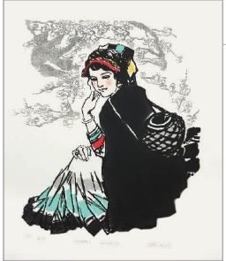 阿鴿曾說,她發(fā)現(xiàn)彝族女孩都有特別飄逸的感覺,尤其是穿著百褶裙。為了記錄下彝族女孩這種特有的美,她畫了很多稿子,去掉了繁雜的明暗關(guān)系,以明快的線條塑造了一個(gè)個(gè)含苞欲放的彝族姑娘,她們或并肩同行、或竊竊私語、或眺望遠(yuǎn)方,嫻靜而文雅。畫中的彝族姑娘多是穿著紅、黃、黑三種顏色的衣裙,系著民族圖案的頭帕,俏皮地斜披在頭上,粗大的發(fā)辮散發(fā)著青春的活力,現(xiàn)代的頭巾把面龐團(tuán)團(tuán)圍住,充分表現(xiàn)出現(xiàn)代彝族姑娘的審美趣味。阿鴿認(rèn)為這三種顏色是代表彝族的顏色,彝族婦女的服飾、餐具基本上都是這幾個(gè)顏色,她把彝族的色彩,裝飾性的線條及西方現(xiàn)代繪畫中的色塊分割,融入版畫的世界里,以黑、紅、黃為基調(diào)反映出彝族特有的審美趣味。