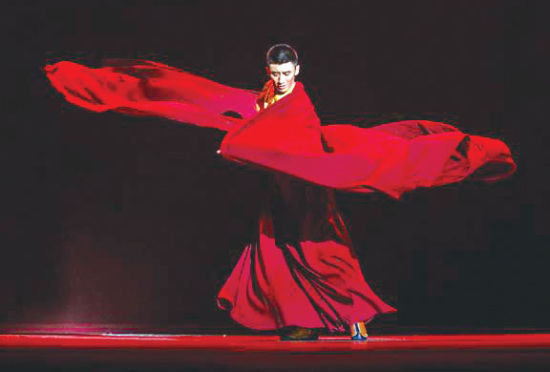 倉央嘉措的舞蹈語言,造型符號是從佛教動作發(fā)展出來的。小倉央嘉措被確定為轉(zhuǎn)世靈童時,他被給定了一個特別的動作——單腿半蹲狀態(tài)下單手合十盤腿轉(zhuǎn),這就成了定格他身份的動作符號。但倉央嘉措是個活生生的人,不是一個死的身份。作為一個詩性敏感的生命,他的性格命運的核心是自然天性與宗教使命的沖突,是愛還是不愛的終極糾結(jié)。對倉央嘉措的舞蹈敘事,主要就成了靈魂掙扎的心靈敘事。導(dǎo)演找到了獨特的辦法:在袈裟與身體的互動中說話。身體,利用倉央嘉措詩句“潔白的仙鶴啊,請把你的翅膀借給我”,化出雙臂渴望自由的飛翔意象;而袈裟,被夸張加長,或恭謹(jǐn)?shù)乇P腰搭肩,或滾地卷攏,或緊勒死纏,或臨空拋出,或互相牽拉。這樣一種特定的身體與袈裟的互動舞蹈,處處精心編織,絲絲牽連著主人公的不同心境——得意、皈依、舒暢、困頓、遮蔽、釋放、恐懼、解脫……可以說,這是出神入化的心靈舞蹈,是獨有的“這一個”的性格舞蹈。