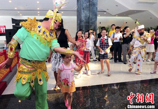 資料圖:國家級非物質文化遺產(chǎn)傣族孔雀舞傳承人旺臘、被人稱為“活孔雀”的國家級非物質文化遺產(chǎn)傣族孔雀舞傳承人約相等教榕臺小朋友跳世界非物質文化遺產(chǎn)“孔雀舞”。中新社發(fā) 張麗君 攝