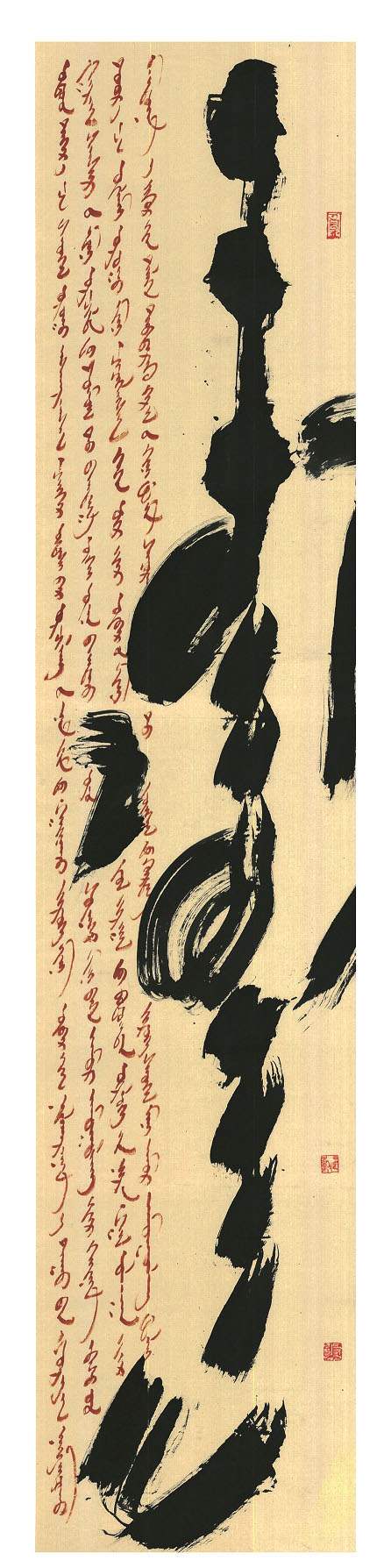 蒙古文書法是一個比較年輕的藝術(shù)形式。蒙古文書法的書寫在執(zhí)筆和運筆方式上都與漢語書法有密切的關(guān)聯(lián),同時形成了自己獨特的運筆方法。藝如樂圖的蒙古文書法創(chuàng)作,更多受到了秦漢簡牘和章草的影響。他對字尾、尤其是挑畫和捺畫的處理,粗獷而有力度,令字體有一種向前的推力和飛動感。而在字符較多的書寫中,尾部的筆畫粗細(xì)、虛實變化,剛?cè)徇m度,錯落而有序,使字與字之間或行與行之間,形成穩(wěn)固而彼此呼應(yīng)的整體。這一特點在他的“成吉思汗箴言”等幾幅蒙古文書法作品中尤其明顯。他的一幅蒙古文條幅,中間為大字的“平安”,濃枯并行,字體峭立而渾厚。而左側(cè)的四行朱砂小字,與右邊的上中下三枚印章遙相呼應(yīng),幾近完美。他善于利用大字與小字的結(jié)合與映襯,將文人畫的構(gòu)圖與書法的空間構(gòu)成巧妙地契合。他的《達(dá)·那楚克道爾吉詩一首》更是令人叫絕,小字如影隨形,大字氣勢磅礴,整體又如大汗引領(lǐng)千軍萬馬?!安屎纭眲t完全用枯墨寫就,蒙古文字特有的象形結(jié)構(gòu),使其有一種君臨天下、百花肅殺的威武和滄桑。這種氣魄與格局,即使在漢語書法中也不易見到。