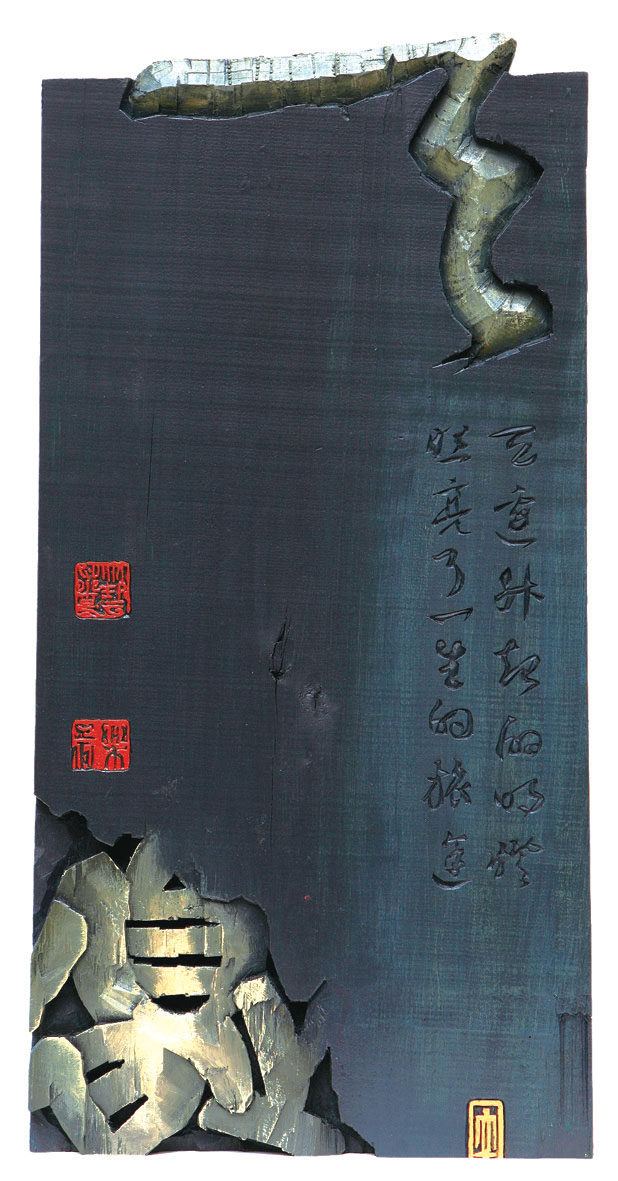 藝如樂圖最令人稱道的還是他的刻字作品?,F(xiàn)代刻字藝術(shù)是用雕刻的手法,通過平面、立體和色彩三種構(gòu)成,表現(xiàn)書法意境的創(chuàng)作形式。它是中國傳統(tǒng)刻字、刻畫藝術(shù)走向?qū)徝雷杂X的一個重要階段。藝如樂圖在吸取中原傳統(tǒng)工藝的基礎(chǔ)上,繼承了北方民族尤其是蒙古先民的巖畫和民間木雕、骨雕、氈雕和皮雕等工藝和方法,形成了自己獨特的風(fēng)格。他將書法、雕刻和繪畫有機結(jié)合,通過筆意與刀法的轉(zhuǎn)換、色彩和材料的裝飾,給人一種古樸而又現(xiàn)代的審美體驗。如《玄之又玄》這件作品,材料是椴木,書體是大篆,“之”與“又”字,共用一個“玄”字。三個字相互勾連穿插疊覆,構(gòu)成一個既抽象又象形的富有張力的整體?!靶中背鲎浴独献印?,表達(dá)道的微妙無形以及創(chuàng)生萬物過程的深奧難測?!靶弊衷阽姸ξ睦锵褚桓K子兩頭對接,然后相對擰轉(zhuǎn),形成兩個圓環(huán),寓意事物從無到有的轉(zhuǎn)變。這件作品恰恰是這一思想的藝術(shù)體現(xiàn)。《天邊》也是我喜歡的作品。一塊矩形的椴本板,上方是草書的“天”,下方是大篆的“邊”,“天”字雕出板面,給人以空間上的延伸感。在技術(shù)上,藝如樂圖巧妙地體現(xiàn)了草書“天”字的墨趣和線條的飄逸感,達(dá)到了“若將飛而未翔”般靜與動審美的臨界狀態(tài),而“邊”字的鐘鼎文的鏤刻效果又給人以金屬的質(zhì)感和遒勁凝重的篆體風(fēng)格。