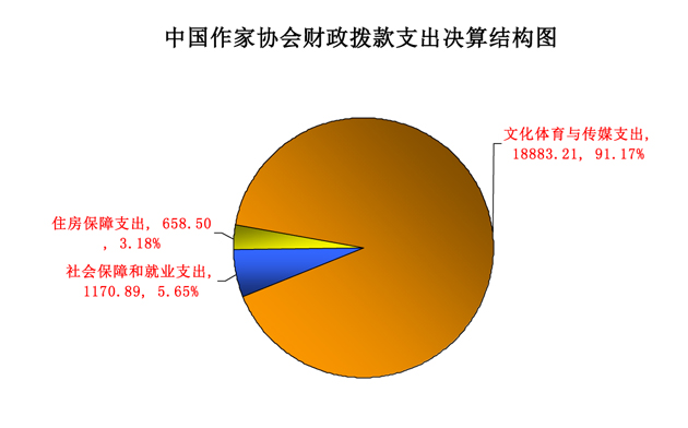 中國作協(xié)財政撥款支出主要用于以下方面:文化體育與傳媒支出18883.21萬元,占財政撥款支出的91.17%;社會保障和就業(yè)支出1170.89萬元,占財政撥款支出的5.65%;住房保障支出658.50萬元,占財政撥款支出的3.18%。