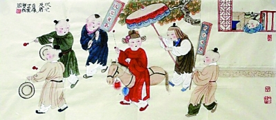 “擇婿”喚作“捉婿”,動感立馬增強,戲謔之情油然而生。那些為功名所累的學(xué)子們,“十年寒窗無人問,一舉成名天下知”。于是乎,聞名而來求婚的人擠破了柴門。不管你是富家子還是窮酸儒,也不管你是少年郎還是老學(xué)究,只要是文曲星下凡,就不愁如花美眷送上門。話說福建有位叫韓南老的人,古稀之年進(jìn)士及第,鄉(xiāng)里人都想與他攀親結(jié)貴。欲釣“金龜婿”的富戶,便托媒妁登門求親。韓南老覺得可笑,遂以打油詩作復(fù):讀盡文書一百擔(dān),老來方著一青衫。媒人卻問我年紀(jì),四十年前三十三。如果說這是齊東野語、坊間傳聞,不足為信,那么下邊這段軼事,卻是見諸堂堂正史。