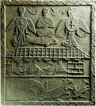 伏羲、女媧形象在漢代畫像磚里出現(xiàn)最多。在中國(guó)古代神話里,伏羲、女媧是人類的始祖,二者位列三皇。傳說伏羲創(chuàng)八卦、結(jié)繩造字,女媧煉石補(bǔ)天、捏黃土造人。他們成婚繁衍了人類,被譽(yù)為中華民族的“人祖”。女媧是有司生育繁子神力的女神,伏羲“制嫁娶”,亦含有司婚姻的意義?!胺伺畫z雙龍樓闕”畫像磚分上下兩部分,上為一座雙闕式建筑,左有一執(zhí)笏官員,躬身迎接,闕內(nèi)一人跪拜;右為伏羲女媧二神,其尾相繞,后延至磚的下部,呈一對(duì)巨龍,構(gòu)圖巧妙。此圖應(yīng)是虔誠(chéng)婦人在官祠里向二神禱告,祈求幸福的婚嫁和綿長(zhǎng)的子嗣。整個(gè)畫面渾然一體,充滿神秘,含義頗深。