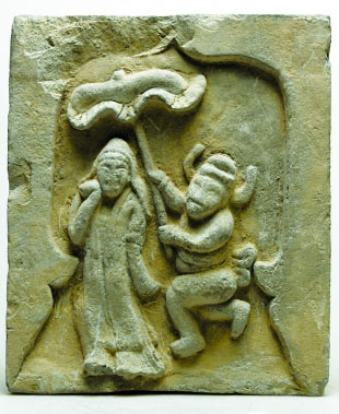 宋代“持荷”畫像磚里反映的是七夕之時(shí),年輕男子持荷作傘為女子遮陽(yáng)避雨。據(jù)文獻(xiàn)記載,北宋都城汴梁有七夕前后折荷花、荷葉的習(xí)俗:“七夕前三五日,車馬盈市,羅綺滿街,旋折未開荷花……又少兒須買新荷葉執(zhí)之,蓋效顰磨喝樂?!边@種蘊(yùn)藏著生活情趣的場(chǎng)景在宋金畫像磚里比比皆是,而文人式的婉約細(xì)膩的現(xiàn)實(shí)主義韻致也在畫像磚中體現(xiàn)得淋漓盡致。
