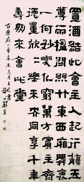 鄭簠素來作書精勤,態(tài)度認(rèn)真,其弟子張?jiān)谛劣凇峨`法瑣言》中言:“先生作字正襟危坐,肅然以恭,執(zhí)筆在手,不敢輕下,下筆遲遲,敬慎為之?!倍@幅藏于上海劉海粟美術(shù)館的鄭簠書法軸內(nèi)容為晉傅玄所作《前有一樽酒行》,原詩為:“置酒結(jié)此會(huì),主人起行觴。玉樽兩楹間,絲理東西廂。舞袖一何妙,變化窮萬方。賓主齊德量,欣欣樂未央。同享千年壽,朋來會(huì)此堂?!倍娭小敖z理”被鄭書為“絲竹”,不知是版本之訛還是筆誤,俟考。然此并無礙這件作品的妙處,其妙處有三:一是作品中體現(xiàn)出的新理異態(tài)。于鄭之前,隸書的用筆平直古板、結(jié)體整齊均勻,而這幅作品用筆有輕重的主次變化,融入草書的疏勁筆意。如“絲”“萬”等筆畫的牽絲連帶以及尾筆飛白的舞動(dòng),皆有草意。二是作品章法上字距寬疏、行距緊密的布局規(guī)律,氣息面貌富有書卷氣息,此常被唐以后多數(shù)寫隸書者所忽視,而這也是令他成為清代碑學(xué)運(yùn)動(dòng)先聲的原因之一。三是這件作品于“三月上巳”所書,以此詩記,可想當(dāng)日他與友人流杯曲水飲宴之狀,頗有書外情境。