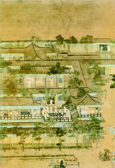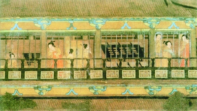 在這座樓閣疊起的王苑公館內(nèi),建以巷道分割的多進(jìn)大小院落,木結(jié)構(gòu)建筑的前廳、后廊,樹蔭掩映,四周環(huán)以回廊。中軸線左右側(cè)建有多座較小院落,明間裝門,左右間裝窗。正如畫面所示,當(dāng)時(shí)的門主要是版門,窗一般為直欞窗和破格子欞窗。廊廡環(huán)繞,一方面通過門和道路組織最佳觀賞路線,另一方面又通過重重廊廡增加縱深感,形成建筑物內(nèi)向的封閉式院落,既表現(xiàn)了豪貴生活的驕縱富有,又顯示了深宮仕女的凄清冷寂。