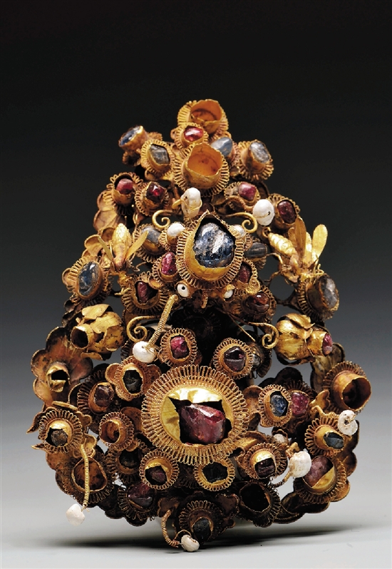 雍容華貴的明代金銀首飾是此次展覽的一大亮點(diǎn),展出的金銀首飾種類齊全,包括頭飾、耳飾、腕飾等,幾乎囊括明代首飾的全部品種;題材也非常豐富,花卉、鳳鳥、宗教題材等都成為裝飾紋樣。這些出土文物精品再現(xiàn)了明代藩王的貴族生活,讓觀眾們直觀感受到15世紀(jì)中葉明代王室宗族奢侈富麗的生活景象。