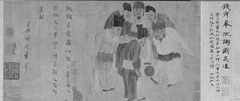 上海博物館日前在“吳湖帆書畫鑒藏特展”中,展出一幅元代畫家錢選(款)紙本設(shè)色《蹴鞠圖》,頗為引人矚目。此原畫傳為南宋名家蘇漢臣所作,畫面設(shè)色淡雅,用線古拙,描繪的是宋太祖趙匡胤與其弟宋太宗(趙匡義)及開國(guó)功勛趙普、楚昭輔、黨進(jìn)、石守信等玩蹴鞠時(shí)的場(chǎng)景。此事在《宋史》和宋代野史筆記中多有記載。