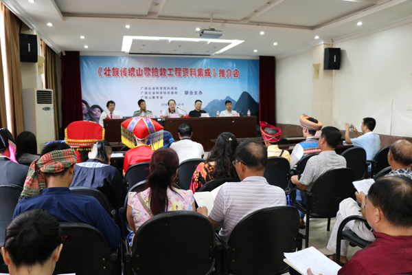 2016年8月22日,由廣西社會(huì)科學(xué)院科研處、廣西社會(huì)科學(xué)院民研所、廣西山歌學(xué)會(huì)聯(lián)合召開的《壯族傳統(tǒng)山歌搶救工程資料集成》推介會(huì)在南寧舉行。參加會(huì)議的有來(lái)自北京的《解放軍報(bào)》文化部副主任、主編曹慧民,中國(guó)大旗文化產(chǎn)業(yè)集團(tuán)董事局主席顏建國(guó),廣西社會(huì)科學(xué)院副院長(zhǎng)黃天貴,廣西社科聯(lián)副巡視員何明,廣西社會(huì)科學(xué)院科研處長(zhǎng)蔣斌等領(lǐng)導(dǎo)同志,以及廣西民族大學(xué)、廣西師范學(xué)院、廣西山歌學(xué)會(huì)、廣西壯歡學(xué)會(huì)等單位的領(lǐng)導(dǎo)、專家教授、歌王、歌手和廣西日?qǐng)?bào)、南國(guó)早報(bào)、廣西民族報(bào)等媒體記者共40余人。會(huì)上,與會(huì)領(lǐng)導(dǎo)和專家教授對(duì)《壯族傳統(tǒng)山歌搶救工程資料集成》工作作了肯定的評(píng)價(jià),并對(duì)民族傳統(tǒng)文化的繼承和發(fā)展問(wèn)題發(fā)表自己的意見(jiàn)和建議。廣西社科院民研所楊昌雄副研究員代表課題組作《壯族傳統(tǒng)山歌搶救工程資料集成》調(diào)研報(bào)告。