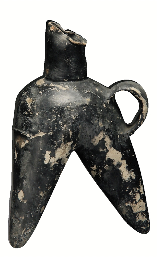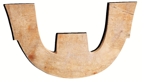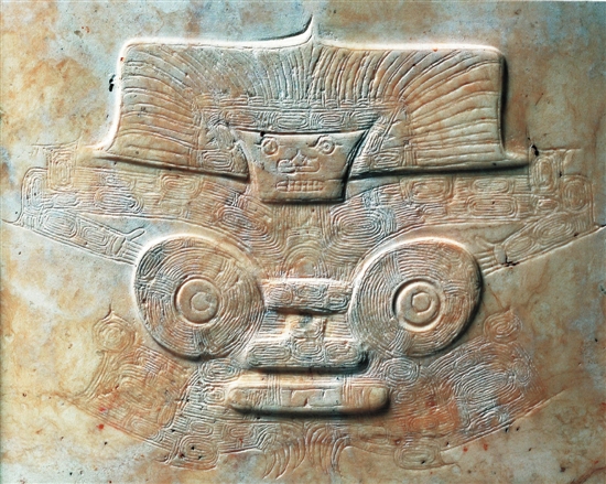 1986年浙江省杭州市余杭區(qū)瓶窯鎮(zhèn)反山遺址M15出土 玉冠狀器為良渚文化時(shí)期帶有禮儀性質(zhì)的裝飾玉器。該器物平面整體呈寶蓋頭結(jié)構(gòu),如同良渚文化晚期的臺(tái)階形玉片的結(jié)構(gòu),冠頂中部切割呈寶蓋頭結(jié)構(gòu),下端扁榫上有三個(gè)等距的對(duì)鉆小孔。正反兩面以透雕和陰線刻劃相結(jié)合的技法,對(duì)稱雕琢肢體俱全的神人圖像,填刻光芒線的寶蓋頭冠帽,倒梯形臉部,單圈眼,一側(cè)刻劃眼角,刻劃有牙齒的寬嘴。神人上臂兩側(cè)各“持”有鳥(niǎo)形象,此部位紋飾或可視為獸面紋的雙眼,神人胸腹部位為一般常見(jiàn)的圓拱形結(jié)構(gòu)。兩面的紋飾除個(gè)別刻劃線條的結(jié)構(gòu)有區(qū)別外,余均一致。