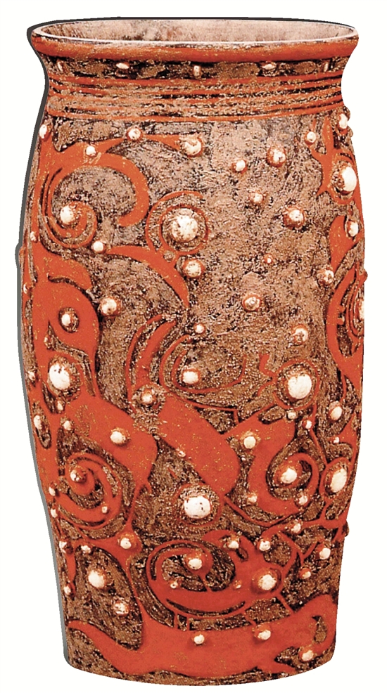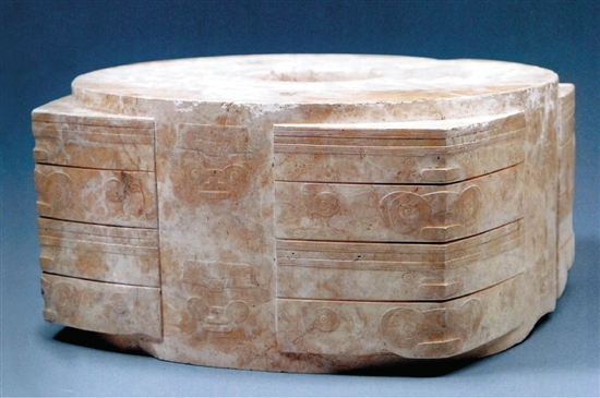 1986年浙江省杭州市余杭區(qū)瓶窯鎮(zhèn)反山遺址M12出土 該件玉琮重約6500克,形體寬闊碩大,紋飾獨(dú)特繁縟,為良渚文化玉琮之首,堪稱“琮王”。器型外圓內(nèi)方,上大下小,中間對(duì)鉆圓孔。琮體四面直槽內(nèi)上下各琢刻神人獸面圖像,整體圖案采用淺浮雕和線刻技法雕琢而成。在呈角尺形的長(zhǎng)方形凸面上,每?jī)晒?jié)琢刻一組象征性的神人獸面圖案,以轉(zhuǎn)角為中軸線向兩側(cè)展開(kāi),獸面的兩側(cè)還各淺浮雕一變形夸張的鳥(niǎo)紋。玉琮,是良渚文明特有的禮儀重器。它的工藝技術(shù)代表了5000年前玉器制作的最高水平;它所體現(xiàn)的用玉制度,揭示了禮儀制度的建立形成,對(duì)中國(guó)后世“禮制”文化的發(fā)展完善產(chǎn)生了深遠(yuǎn)影響。特別是上面的神人獸面圖案,是具有共同信仰的原始宗教重要標(biāo)志。
