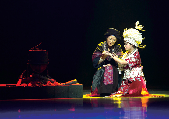 第五屆全國少數(shù)民族文藝會(huì)演精彩紛呈。9月上旬,侗族音樂劇《嘎老》和苗族舞蹈詩《巫卡調(diào)恰》兩臺(tái)劇目將與觀眾見面。《嘎老》圍繞男女主人公尋歌之旅展開,通過侗族大歌、琵琶歌等侗族音樂與現(xiàn)代音樂的碰撞,展示出侗族音樂的魅力,并詮釋侗家人“沒有什么比唱歌更重要”的精神追求?!段卓ㄕ{(diào)恰》的創(chuàng)作根植于當(dāng)?shù)孛缱逦幕滞卣沟秸麄€(gè)苗族社會(huì),通過巫卡吟唱古歌這一主線,詮釋了苗族人的創(chuàng)世觀,反映了古代苗族人的農(nóng)耕文化、苗族遷徙史以及苗族社會(huì)生活的各種習(xí)俗等。 圖為《巫卡調(diào)恰》劇照。 (明 江)