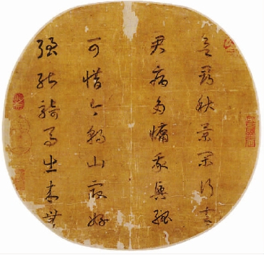 團(tuán)扇草書七言絕句一首,四行,每行七字。無詩題及落款。末行左側(cè)鈐“德壽”朱文葫蘆印。此印為高宗禪位于太子趙昚,退居德壽宮長鈐之印,故知此扇為其退位后書。上書詩為白居易《絕句代書贈錢員外》 ,見《白氏長慶集》 。扇面右鈐《孔氏鑒定》朱文長方印,右上殘印漫漶不清,左側(cè)鈐《明安國印》白文方印。