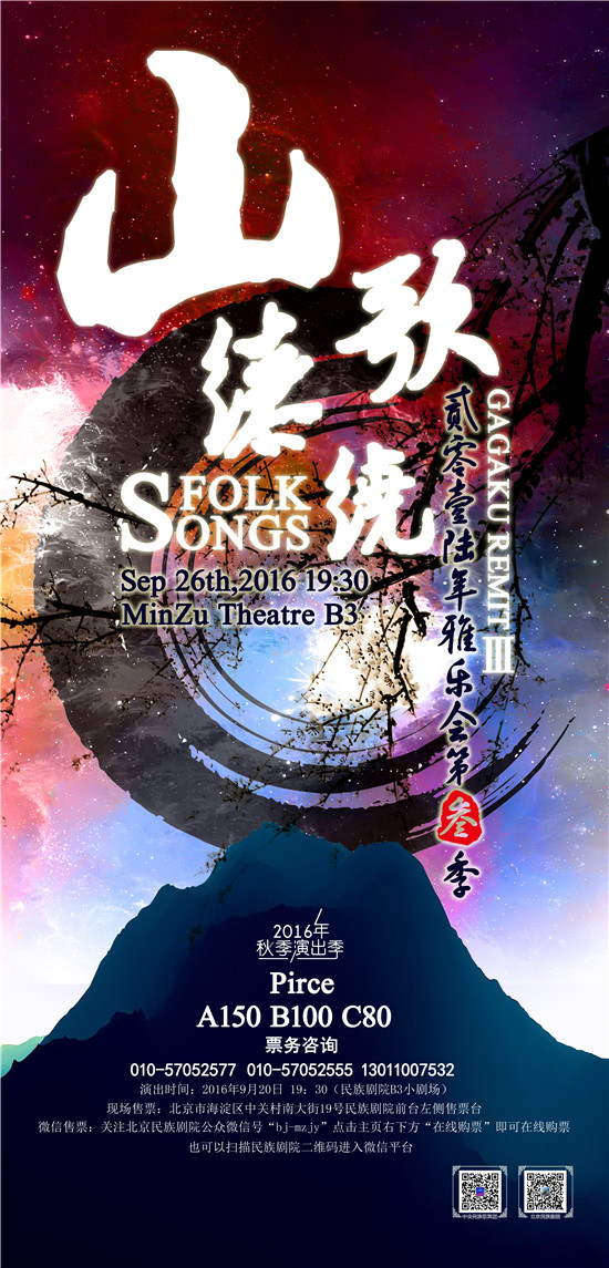 9月26日,《山歌繚繞——2016雅樂匯第三季》將在民族劇院B3小劇場上演。山歌是指人們在田野勞動或抒發(fā)情感時即興演唱的歌曲,其內(nèi)容廣泛、結(jié)構(gòu)短小、曲調(diào)爽朗、情感質(zhì)樸、節(jié)奏自由 。山歌主要集中分布在高原、內(nèi)地、山鄉(xiāng)、漁村及少數(shù)民族地區(qū),流傳極廣,是中國民歌的基本體裁之一。9月26日,一場“山歌”的音樂大餐將在民族劇院B3小劇場上演。