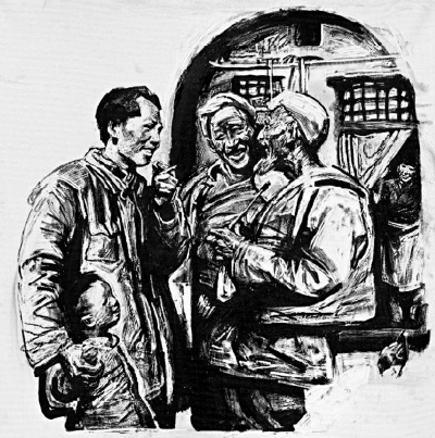 人物塑造從來是沈堯伊的強項,畫家對生命個體特征的捕捉體現(xiàn)一個“狠”字。在這里,形肖是個體特征適度夸張、強調(diào)的肖,更是神魂的肖,故有深度兼厚度。經(jīng)“紅飄帶”及相關(guān)歷史畫的長年塑型,畫家對有名有姓主要人物的氣質(zhì)、性格、動態(tài)特征尤其臉部結(jié)構(gòu)、表情特征,已然把握在胸,隨角度需要而塑造。軍人、農(nóng)民、苦力、外國人……力求生命的個體征候,讀者因之過目難忘。筆者也注意到,作為人物“第二表情”的“最難搞定”的手,被畫家賦予了個性并形成表現(xiàn)上的語言風格,信手寫來,甚見功力??v觀艱苦環(huán)境中的蕓蕓眾生,基本筆調(diào)是苦澀的滄桑的,苦中作樂,間插其中,必要的浪漫賦予作品史詩氣質(zhì)。