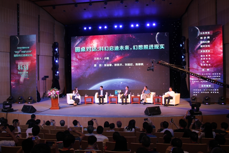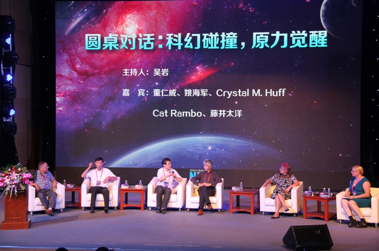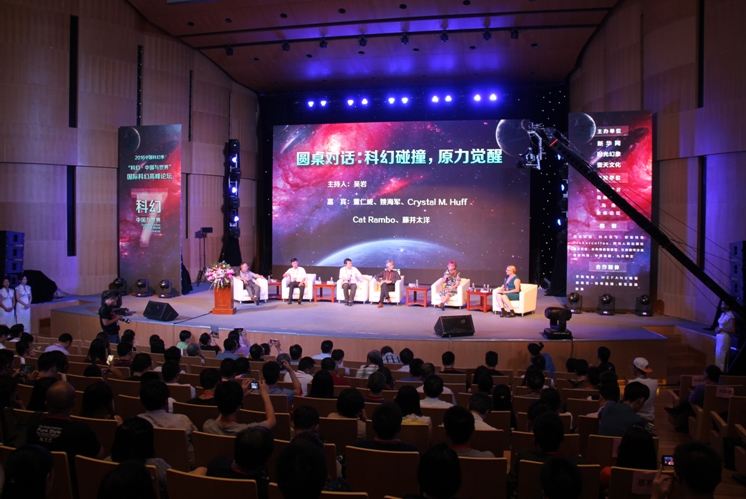 在這次高峰論壇的第一單元:“世界科幻之巔”中,華語科幻星云獎(jiǎng)創(chuàng)始人作為中國(guó)代表與美國(guó)科幻奇幻作家協(xié)會(huì)主席凱特?蘭博分別作了主題發(fā)言。中國(guó)、美國(guó)、日本的星云獎(jiǎng)主席會(huì)長(zhǎng)與世界科幻大會(huì)雨果獎(jiǎng)聯(lián)合主席開展了圓桌對(duì)話。