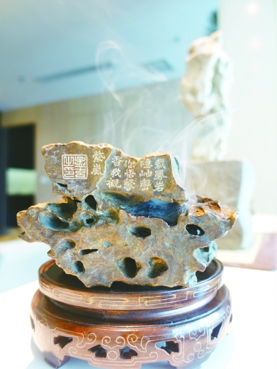宋人趙希鵠的《洞天清祿》中記載:“東坡小有洞天石。石下作一座子,座中藏香爐,引數(shù)竅正對(duì)巖岫間,每焚香則煙云滿岫。今在豫章郡山谷家,其家珍重,常與告身同置一匣”(告身:委任官職的文憑)。蘇軾到底是名人,連他的玩,都被世人傳頌。這個(gè)名為“小有洞天”的觀賞石,經(jīng)東坡居士獨(dú)出機(jī)杼的打造,把只有觀賞功能的供石,變成了有入鼻、入心功能的靈石香爐。玩觀賞石要配置相襯的底座,蘇軾將底座的內(nèi)部空膛內(nèi)藏香爐,同時(shí),底座的表面上、緊貼觀賞石腳底的地方,開(kāi)有若干小孔。這樣一來(lái),暗藏于底座內(nèi)的香爐一旦焚香起煙,便有煙絲從觀賞石腳底的各個(gè)孔竅中裊裊飄出,煙云滿岫。足不出戶,便賞山林之氣;坐擁禪室,頓感氣象萬(wàn)千。