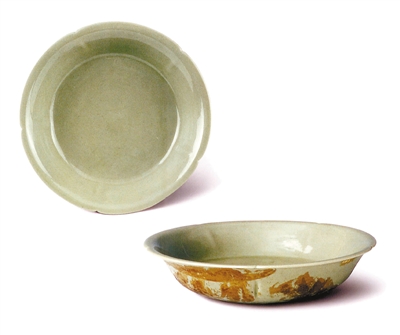 “秘色瓷”一詞最早出現(xiàn)在晚唐詩歌中。唐陸龜蒙對其有“九秋風(fēng)露越窯開,奪得千峰翠色來”之詠。前蜀開國皇帝王建在給后梁開國皇帝朱溫的致謝信中稱贊對方信物中的越窯秘色瓷器“秘色抱青瓷之響”……這些詩情畫意的描述勾起后人對秘色越器的種種遐想和神往。宋代關(guān)于秘色瓷為“供奉之物,不得臣庶用之,故云秘色”的說法更為其平添了幾分神秘色彩。北宋以后,“秘色瓷”消失得無影無蹤,在此后很長一段時間里人們對它的理解也莫衷一是。明清文獻如《格古要論》《長物志》和《飲流齋說瓷》等,對越窯的描述僅僅是轉(zhuǎn)述傳聞而已。直到上世紀八十年代,隨著陜西法門寺真身寶塔西半部轟然倒塌,十三件“秘色瓷”得以告別漫長的幽居歲月,重見天日,方解開了“秘色瓷”的千古之謎。現(xiàn)今在中國國家博物館展出的一件法門寺地宮出土的“唐代越窯五瓣葵口秘色瓷盤”(見圖),便一展“秘色瓷”的風(fēng)采——造型圓潤飽滿,像一朵盛開的蓮花;釉色碧綠澄澈,如一泓盈盈秋水。