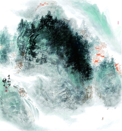 《旭日東升》在畫面構圖中,畫家將嶺峰組合、云霧交織、瀑樹穿插等表現(xiàn)要素有機聯(lián)系起來,并將其規(guī)律有序地調(diào)度在畫面上,呈現(xiàn)出群山縱橫、層次分明、舒朗有序的局面,給人自然和諧的感覺。在畫幅中央位置,近景蒼松襯托著中景的主峰,主峰昂首天外呼應著遠景的紅日,使構圖平中見奇,并借助中國山水畫中的深遠法強化畫面空間感,讓人似乎置身其境,目睹霞光重嶺,感受到旭日東升的藝術境界。