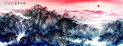 在《旭日東升》畫作中,比較突出的一點就是畫家采用濃烈的朱砂紅來表現(xiàn)紅日、云空和朝陽下的重重山川,這是此幅佳作中最響亮、最耀眼的一筆。這種設色大大增添了畫面裝飾感,形成強有力的視覺沖擊。這還不止,畫家還遵循紅日普照山川的自然規(guī)律對畫面做了添光增彩的渲染,讓承天接地的紅基調(diào)占據(jù)了畫幅主導位置,成為烘托主題氣氛、營造畫面意境的得力要素?!缎袢諙|升》畫作上鮮艷的紅色調(diào)連著主題、連著意境,讓人激動。試想,若將此幅畫面上的朱砂紅改變或者減弱,《旭日東升》的藝術感染力將會黯然失色,甚至畫面意境將會消退。在中國山水畫中,尤其是傳統(tǒng)畫法中,概念用色是常見的方法,因此,大膽使用主觀顏色往往可以獲得意想不到的效果。