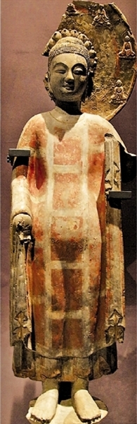相對前一尊造像而言,青州龍興寺遺址出土北齊佛立像(圖2)則要簡潔得多。這是一尊單體的圓雕佛像,沒有背屏和脅侍菩薩。東魏佛造像是在北魏晚期實(shí)例基礎(chǔ)上的繼續(xù)發(fā)展,那種背屏式造像,其實(shí)是對此前石窟造像的模仿。在東魏時(shí)期,背屏式造像中的佛像軀體逐漸變得厚實(shí)起來。大約在進(jìn)入北齊后,佛像脫離背屏而變成圓雕佛像。這尊北齊佛立像跣足立于蓮臺山,低肉髻,有細(xì)密的螺發(fā),面相豐圓,雙目微睜,嘴角上翹,左手殘缺,右手手指也被破壞,似乎在施與愿印。佛像著通肩式袈裟,袈裟表面畫有紅白相間的粗大田相格。值得注意的是,這尊佛像袈裟表面并沒有雕刻衣紋,只在兩臂下垂衣襟及袈裟下緣表現(xiàn)有簡潔的褶皺,整體特征與印度笈多朝薩爾納特不表現(xiàn)衣紋的“裸體佛像”有諸多相似之處,只是青州實(shí)例人體造型明顯單薄、含蓄,這是中國古代匠工受儒家禮教思想的影響所致。另外,頭光中心綻放的蓮花浮雕厚實(shí)且圓潤,與外緣的化佛組合在一起,傳達(dá)出鮮明的佛教信仰內(nèi)涵。