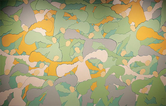 王藝的壁畫巧妙結(jié)合了傳統(tǒng)和現(xiàn)代元素。中國國家畫院“絲綢之路”藝術(shù)考察的所見所聞,中國傳統(tǒng)繪畫中的“沒骨”筆法,無不給予其豐富的創(chuàng)作靈感。如《游春圖》色彩濃麗明快、豐富而和諧,用線和造型頗具寫意人物畫特有的諧趣。繪畫語言上整合了民間繪畫的勾線平涂法和敦煌壁畫中的勾勒形式,以連續(xù)的圖案交疊拼排。純色之間的相互映照、補(bǔ)色對比形成的張力,使得畫面生發(fā)出繁茂古樸、新鮮活潑的趣味。《禮樂圖》畫面中人物紛雜、長袖善舞,雖無面部表情,但身體的姿態(tài)呈現(xiàn)出和諧與放松,極具裝飾效果。這一系列作品有著濃厚的哲學(xué)思辨意味,既有對東方平面化審美傳統(tǒng)的含蓄因循,又有作者一貫的詩意化放縱,在其藝術(shù)創(chuàng)作中保持著一種語言層面的遞進(jìn)關(guān)系。