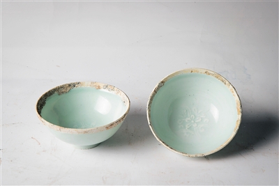另外兩只南宋茶盞同樣也是出自湖田窯的影青瓷。制造者用模子在盞底印出凹凸的花紋,茶盞雖小,一只小小五瓣朵栩栩綻放,不難想象當(dāng)年喝茶人端起這青白雅致的茶盞時心中的那份欣喜。碗口同樣也曾以銀鑲裹。丁英俊在杭州看到這兩只茶盞時也是立即收入。