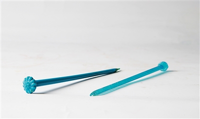 在7件捐贈藏品中,有兩支湖藍(lán)色的琉璃發(fā)簪很是搶眼。兩支發(fā)簪一支透明、一支不透;簪體表面光滑,呈釘狀;頂端作一圓形帽頂,作花飾狀。翻閱香港中文大學(xué)文物館出版的《中國古代玻璃》一書,我們看到了極為相似的幾款發(fā)簪。根據(jù)書中介紹,發(fā)簪是先制出簪身,固化后再加熱單模壓制花飾。
