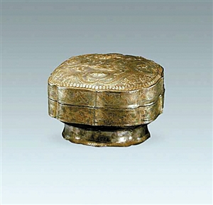 ▲唐鎏金雙獅紋菱花圈足銀盒。