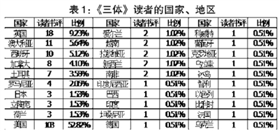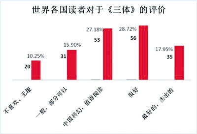在作品風(fēng)格和故事情節(jié)的分析中,有27.18%的人明確提到了“中國(guó)科幻小說(shuō)”,有28.72%的讀者認(rèn)為“很好”,17.95%的讀者認(rèn)為《三體》是“最好的”“杰出的”小說(shuō),三項(xiàng)合計(jì)為73.85%,恰好印證了2萬(wàn)多讀者給《三體》打出4分、5分的人數(shù)比例。可見“中國(guó)科幻”小說(shuō)、“非西方風(fēng)格”是《三體》贏得世界上這么多讀者青睞的主要原因。比如有個(gè)英國(guó)讀者寫到:“作為一個(gè)英語(yǔ)國(guó)家的讀者,我讀的大部分小說(shuō)都是西方式的或者英語(yǔ)國(guó)家式的。這部小說(shuō)讓我讀起來(lái)感覺很新鮮,人物不再是常見的美國(guó)式的、英國(guó)式的或者歐洲式的,也不是澳大利亞式的。讀劉慈欣的書,既是閱讀一部包含中國(guó)歷史文化的科幻小說(shuō),也是閱讀一部不以英語(yǔ)國(guó)家和說(shuō)英語(yǔ)的人物為中心的小說(shuō)。”有美國(guó)讀者寫道:“沒(méi)有讓我失望,與我讀過(guò)的科幻小說(shuō)很不一樣,期待閱讀下一部。”“我很喜歡這部小說(shuō),它充滿了令人驚喜的科學(xué)概念,此外小說(shuō)中的觀點(diǎn)是非西方式的?!?/p>