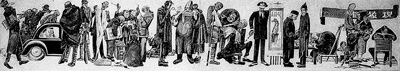 就現(xiàn)實(shí)戰(zhàn)斗性和社會(huì)震撼力而言,丁聰在抗戰(zhàn)時(shí)期和內(nèi)戰(zhàn)時(shí)期的政治諷刺畫,無疑最為突出,也最能反映出他的銳氣。一幅《現(xiàn)象圖》長(zhǎng)卷,形象勾畫出抗戰(zhàn)后期的政府腐敗和社會(huì)慘狀。貪官、傷兵、淑女、官商、窮教授、沽名釣譽(yù)的畫家……形形色色的人物,構(gòu)成了現(xiàn)實(shí)生活真實(shí)的畫面。三年后創(chuàng)作的另一長(zhǎng)卷《現(xiàn)實(shí)圖》成為《現(xiàn)象圖》的延續(xù)。內(nèi)戰(zhàn)風(fēng)云中大發(fā)戰(zhàn)爭(zhēng)財(cái)?shù)闹型馍倘?、饑餓中的窮人、被迫上陣的炮灰……在丁聰?shù)墓P下,不同身份的人物排列一起,便成了那個(gè)時(shí)代的縮影。