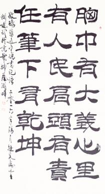 11月30日,在聽完習(xí)近平總書記在第十次文代會(huì)、第九次作代會(huì)開幕式上的講話后,50多歲的軍旅書法家、中央電視臺(tái)軍事頻道編導(dǎo)劉建武大校難以抑制激動(dòng)的心情,當(dāng)夜用他擅長(zhǎng)的漢隸將習(xí)近平總書記在講話中提出的“胸中有大義、心里有人民、肩頭有責(zé)任、筆下有乾坤”書寫了下來,他寫了一張又一張,一直忙活了一夜,終于寫出了一張自己滿意的作品。