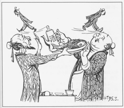 丁聰是多面手,但他畫得最多的還是漫畫?!奥嫛币辉~,從西方引進(jìn),包含著諷刺、幽默、世態(tài)、笑話等多種畫體,丁聰都有涉及,但在丁聰筆下最為犀利也最為杰出的是社會(huì)諷刺畫。
