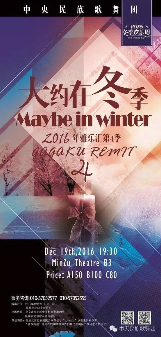 《2016年雅樂(lè)匯第四季—大約在冬季》將于12月19日在民族劇院B3小劇場(chǎng)帶來(lái)一場(chǎng)充滿(mǎn)溫情的音樂(lè)會(huì),給觀眾帶來(lái)冬天音樂(lè)的別樣感受。
