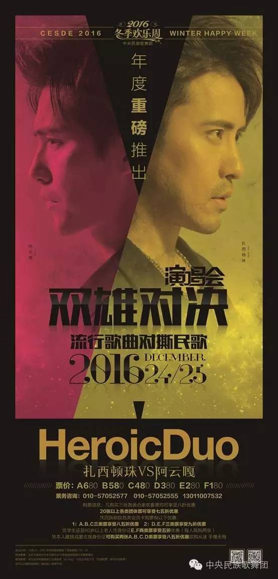2016冬季歡樂(lè)周的重點(diǎn)演出無(wú)疑將是《雙雄對(duì)決——扎西頓珠VS阿云嘎》這臺(tái)獨(dú)特的音樂(lè)會(huì),是一次音樂(lè)人之間的對(duì)話(huà)和握手,這場(chǎng)獨(dú)一無(wú)二的演出不容錯(cuò)過(guò)。