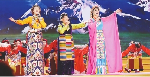 降央卓瑪(左)與才旦卓瑪(中)、宗庸卓瑪(右)在第十次全國(guó)文代會(huì)聯(lián)歡會(huì)上合唱