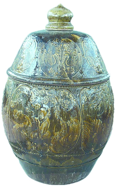 河北省豐寧滿族自治縣是多民族地區(qū),曾先后有肅慎、山戎、匈奴、庫莫奚、契丹、女真、蒙古、滿洲等民族聚居,他們在這里創(chuàng)造了燦爛的民族文化,同時也給后世子孫留下了大量的珍貴文物。豐寧博物館收藏著一件遼代的“三彩瓷枕”(左圖)。這件“鎮(zhèn)館之寶”學(xué)名是“三彩云頭形雙碟牡丹紋貼花獅面五角長方形枕”,是遼代的生活用品,目前在全國是唯一一件。右圖為“和尚坐罐”,又叫“蟹青釉開光龍鳳仙人壽字松鶴紋帶蓋葫蘆頂大甕”,為元代和尚的喪葬用品,全國也只發(fā)現(xiàn)兩件。