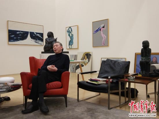 這個(gè)畫(huà)室里一切物體的色彩都有著高飽和度和對(duì)比度,和馮小剛的語(yǔ)言一樣利落。他隨意地倚坐在紅色的單人沙發(fā)上,說(shuō):“開(kāi)始吧!”