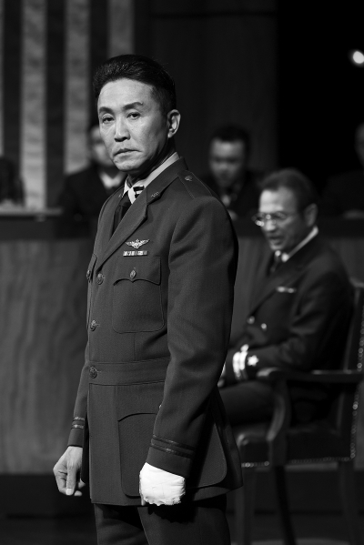 劇場(chǎng)里,開(kāi)場(chǎng)鐘早已敲過(guò)三遍,格林渥穿著硬朗帥氣的軍人制服站在舞臺(tái)上,發(fā)絲根根锃亮,兩側(cè)剃得極短,帶著烏青。他巧舌如簧,質(zhì)疑著每一個(gè)企圖為原告作證的人,他是被告的律師,卻以狡黠的詭辯取得了最終勝利;而走出法庭后,他才說(shuō)出了潛藏內(nèi)心的真實(shí)想法。