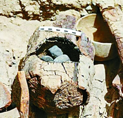 在一座墓葬里,男尸肢體西側(cè)有一用于火祭的容器。容器中間鑿出圓坑,出土?xí)r中間還有15枚石子,圓坑的內(nèi)壁被火灼得發(fā)黑。這一發(fā)現(xiàn),讓考古隊(duì)員確定這里就是拜火教遺址。