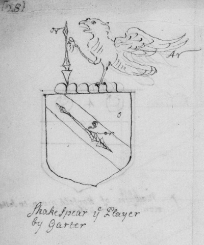 莎士比亞家族的盾徽大概是什么樣子,我們早已知道,因為莎士比亞墓碑的上方就有(圖2)。另外,早在1908年之前就已經(jīng)有7幅莎士比亞盾徽草圖被3家機構(gòu)收藏,位于倫敦的英國盾徽院藏有4幅,牛津大學(xué)圖書館藏有1幅,美國的福爾杰圖書館藏有2幅。這些盾徽草圖與之莎士比亞墓碑上的盾徽大同小異。盾冠是一只展開雙翅的隼。莎士比亞生前最喜歡這種猛禽,其著作中隼字出現(xiàn)的次數(shù)高于任何其他鳥名。隼的一只爪抓著一根矛(spear)的柄,用來會意構(gòu)成Shakespeare這一姓氏的shake和spear(“搖動”“矛”)。盾徽本身的圖案是,以一條黑帶為背景,黑帶上一只矛斜貫整個盾徽,矛尖與筆尖相似,矛柄與筆桿相似。這恐怕不是偶然巧合,而是暗示威廉·莎士比亞的作家身份。福爾杰圖書館收藏的草圖中,有一幅的圖案下方標(biāo)注著“戲子莎士比亞,襪帶騎士繪”的字樣(如圖3)。照理說,既然沒有任何證據(jù)表明倫敦當(dāng)時有兩個同叫莎士比亞的戲子,或一個戲子,一個作家,盾徽草圖和墓碑上的盾徽便構(gòu)成一個證據(jù)鏈,證明倫敦的戲子莎士比亞和葬于斯特拉特福鎮(zhèn)的莎士比亞是同一個人。然而倒莎派提出,這兩個盾徽都是莎士比亞去世之后雕刻或繪制的,不足為憑。