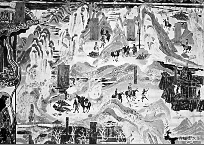 色彩繪畫(huà)逐漸衰落并失去中心地位,水墨繪畫(huà)不斷發(fā)展壯大并成為主流,這是一個(gè)漫長(zhǎng)的變化過(guò)程。山水畫(huà)中天空水面由施染色彩到不施色彩,反映了時(shí)代審美風(fēng)尚的轉(zhuǎn)變。李白《觀(guān)博平王志安少府山水粉圖》一詩(shī)作于天寶三年(744年),敦煌莫高窟第217窟建于景龍年間(707—710年),是敦煌望族陰氏家族所建的功德窟。李白所見(jiàn)的那幅天空不設(shè)色的山水畫(huà)、敦煌莫高窟的南壁經(jīng)變畫(huà)面,在色彩繪畫(huà)盛行的當(dāng)時(shí)非常罕見(jiàn)、別具一格,為山水畫(huà)發(fā)展中的水墨之變提供了佐證,說(shuō)明在初盛唐時(shí)期,水墨繪畫(huà)已經(jīng)開(kāi)始滋長(zhǎng),水墨之變已經(jīng)漸露端倪。