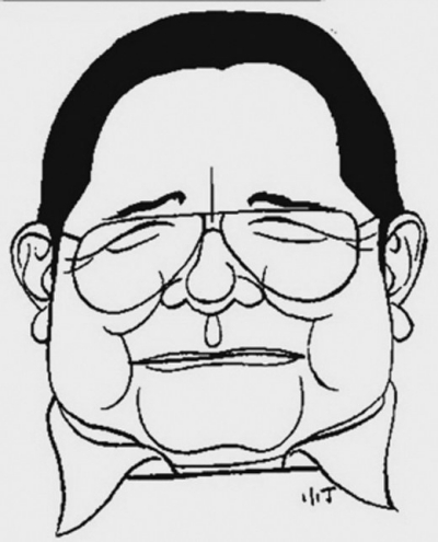 這部“肖像集”中的大多數圖,由于簡潔生動,已在報刊上多處引用,所以很多讀者都曾見到。不過其中與畫相配“寫”的內容,人們也許了解略少。譬如曾任三聯(lián)書店老總的范用對自己的漫畫肖像說:“我很丑,也不溫柔。一本正經,鬼都不相信。謹防上當,不要跟著感覺走。十足糊涂蟲,左右拎勿清。曾經深愛過,曾經無奈過。誰能告訴我,什么是什么?!边@其中的滋味,人過中年也許都不難體會;著名漫畫家華君武面對自己的肖像漫畫自述:“我屬兔,1915年生,大概在1992年,請人刻了一塊閑章‘大愚若智’,也用在某些漫畫上,實際上也是對我?guī)资旯ぷ鞯目偨Y?!碧热羯陨苑词。按笥奕糁恰辈皇俏覀兩嬷谐R姷挠腥と松F(xiàn)象嗎?