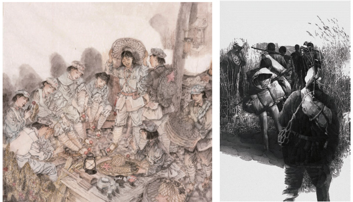 表現(xiàn)形式的自由和文學(xué)性的敘事方式是連環(huán)畫(huà)的特質(zhì)與優(yōu)勢(shì)。入選作品中既有《走過(guò)長(zhǎng)征的過(guò)山炮》(白潤(rùn)祥)那樣的筆意酣暢剛勁、氣勢(shì)磅礴的宏大敘事,也不乏《紅軍長(zhǎng)征故事——女紅軍故事》(唐鼎華)一類(lèi)的輕松靈動(dòng)、活潑精巧的感人故事;既有《長(zhǎng)征——理想與信念的詩(shī)篇》(張曉東)利用傳統(tǒng)畫(huà)種的天然屬性創(chuàng)造的精神圖式,也有《第一騎兵師》(鄭萬(wàn)林)融會(huì)貫通了外來(lái)藝術(shù)的個(gè)性化表達(dá)。畫(huà)家們以富于時(shí)代氣息的藝術(shù)語(yǔ)言和表現(xiàn)方式,豐富和深化了連環(huán)畫(huà)文學(xué)性的內(nèi)涵。
