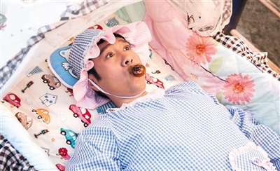 在前段時(shí)間一個(gè)爆紅的電影MV里,越來(lái)越放飛自我的蔡國(guó)慶唱著《蔡國(guó)慶送你365個(gè)“不”祝?!罚贿厫焊阕约旱某擅?,一邊化身霸道總裁、奶嘴寶寶和紅領(lǐng)巾少年。前一秒,舉手投足間還是正統(tǒng)的央視范兒,笑容妥帖、歌聲嘹亮。后一秒,就戴上滿是荷葉邊的嬰兒帽化身“巨嬰”。