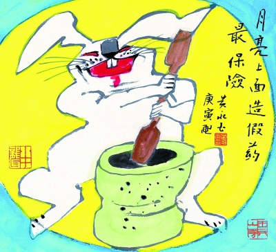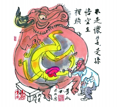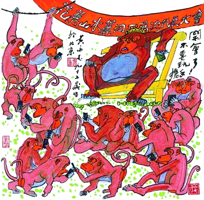 黃先生生肖畫的最大特色就是其“黃氏幽默”,他用他的具有漫畫特點(diǎn)的形象構(gòu)成,他用他的題語,以文與圖相得益彰的配合,往往令人拍案叫絕——他畫“嫁狗隨狗”,一個打著領(lǐng)帶蹲著的狗,左側(cè)站立一盛裝但不露臉的新娘;畫一鄉(xiāng)間常見的趕著種豬的人,“豬賣愛情人收錢”;畫一肥豬,“人自己減肥卻怕我瘦”;畫一只貓推著坐著老鼠的車,“也不想一想,牠為什么對你這么好”;而畫“老鼠吹牛系列”,之一“我把老鼠夾子當(dāng)健身器”;之二“我拿耗子藥當(dāng)早餐”;之三是老鼠指著挺著大肚子懷孕的貓,說“牠肚子是我搞大的”。如此等等,他的這樣一種諷刺而幽默的方式,不管是用于政治的、社會的、還是生活的,都形象地表達(dá)出了對一個問題的看法。其中有些是直面現(xiàn)實(shí)的,如畫身陷囹圄的父子,“虎父無犬子”;畫月亮前的搗藥的兔子,“月亮上造假藥最保險(xiǎn)”;畫被馬的后蹄踢倒的伯樂,“伯樂早晚也會挨一腳”;畫一背雙肩背書包、壓彎了腰的男童,諷刺當(dāng)下小學(xué)生學(xué)業(yè)太重的問題;在“花果山水簾洞二萬次代表大會”的橫幅下,老猴王正在大叫“開會了!不要玩手機(jī)”,而其前面塞滿畫面的15只猴,個個在玩手機(jī)。