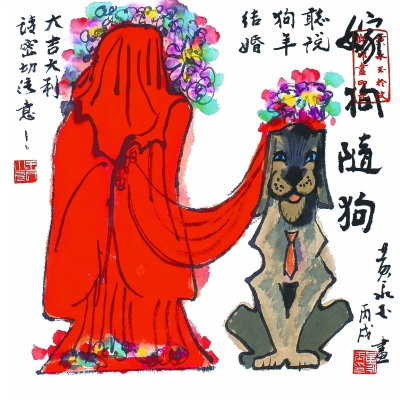 黃永玉先生與生肖畫有著特別的緣分。1980年,中國郵政發(fā)行了由黃永玉先生設(shè)計(jì)的首輪生肖猴票,此后到現(xiàn)在,這第一輪的猴票成了集郵界的神話,無與倫比,也難以復(fù)制,市場價位更是神話級的直線躥升。12年之后,他再次與中國郵政合作,又有了中國郵政第二輪的猴票。此間曾經(jīng)在2006年,中國郵政也希望黃先生設(shè)計(jì)狗年生肖票,無奈,黃先生設(shè)計(jì)的是狗撒尿的造型,未獲理解而未能通過。黃先生又不愿意屈就,也就成了一次不愉快的記憶。然而,正是這一年,或許是因?yàn)檫@不愉快又一氣畫了12張一系列的生肖狗,并印制了掛歷,從而開啟了12年的連續(xù)動作。