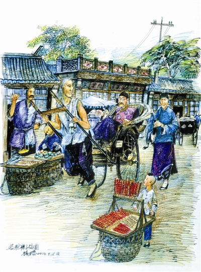 畫老舍先生的作品就是要體會他字里行間的韻味,系統(tǒng)地再現當時的生活場景。讓人們深刻記住老舍先生描述的祖輩們的生活,是我這次畫展的初衷。畫老舍先生的作品是要非常用心的,用怎樣的技法,才能淋漓盡致地表現京味文化的韻味,是我從開始創(chuàng)作就苦苦追求的。藝術崇尚的是自然、現實,只有表現出深刻的內涵,不落窠臼又清晰準確,才能讓大家喜歡和接受,我想這就是“老舍先生6部作品插圖”繪畫技法的真諦。